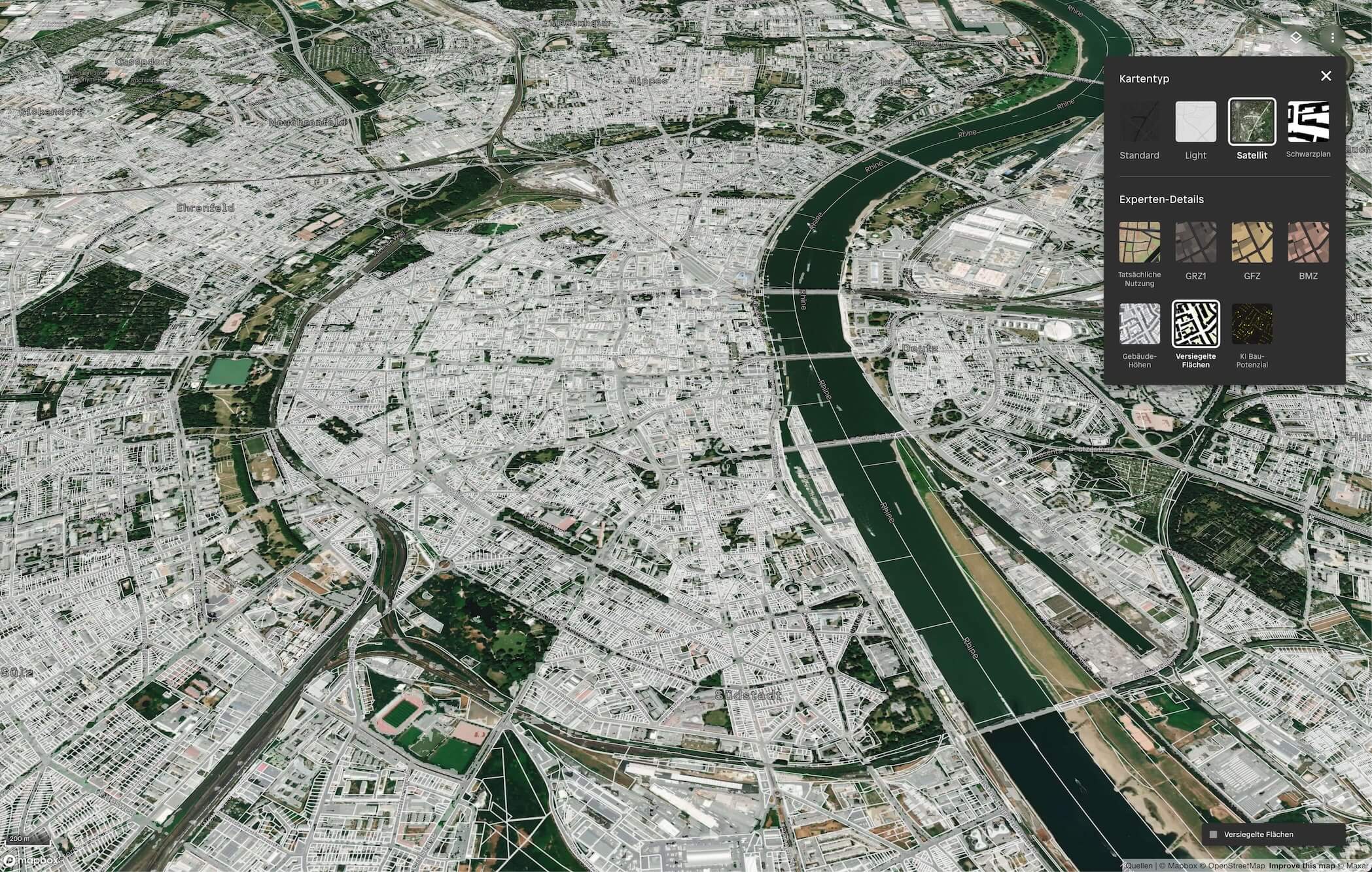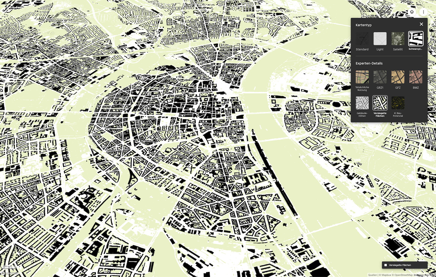 Um die Flächenversiegelung des Grundstücks zu visualisieren, steht ein neuer Experten-Layer für die Karte bereit. Der Layer kann auch genutzt werden, um bei niedrigerer Zoom-Stufe die Versiegelung ganzer Areale zu betrachten. Der Layer ist kombinierbar mit allen Basis-Karten, besonders gut funktioniert die Kombination mit dem Satellit- oder Schwarzplan-Layer.