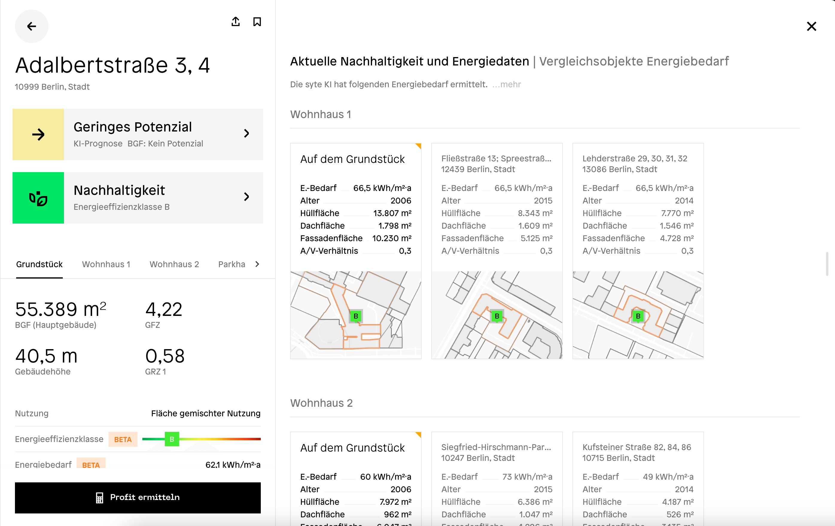 Mit dem Mai-Update verbessert sich die Genauigkeit bei der Angabe der Energieeffizienzklassen von Wohngebäuden. Dafür wurde ein Machine-Learning-Modell entwickelt, welches jedes Gebäude mehreren Vergleichsgebäuden gegenüberstellt, zu denen die Energiebedarfe bekannt sind. Diese Vergleichsobjekte können jetzt mit einem Klick eingesehen werden, um manuell Unterschiede und Gemeinsamkeiten festzustellen. syte arbeitet weiterhin laufend an Systemen, mit denen die Datengrundlage der Berechnung der Energiebedarfe und Energieeffizienzklassen verbessert werden kann.