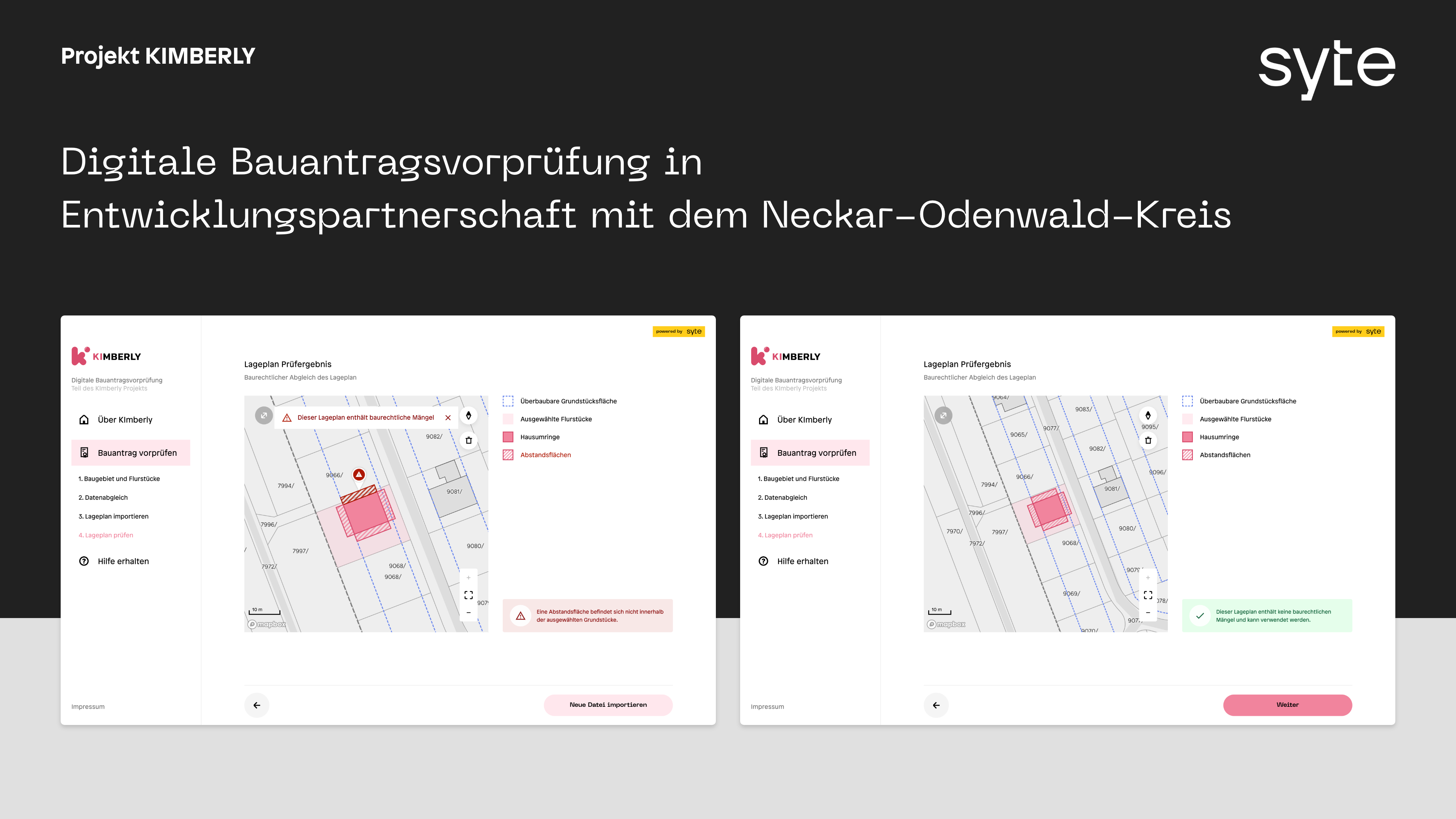 In Zusammenarbeit mit dem Landratsamt Neckar-Odenwald-Kreis haben wir bei syte das Projekt „KImberly“ entwickelt – einen innovativen Ansatz zur Automatisierung zentraler Schritte im Baugenehmigungsverfahren. Das Projekt wurde kürzlich dem Staatsministerium Baden-Württemberg vorgestellt und zeigt, wie Digitalisierung und Künstliche Intelligenz den Genehmigungsprozess effizienter gestalten können.