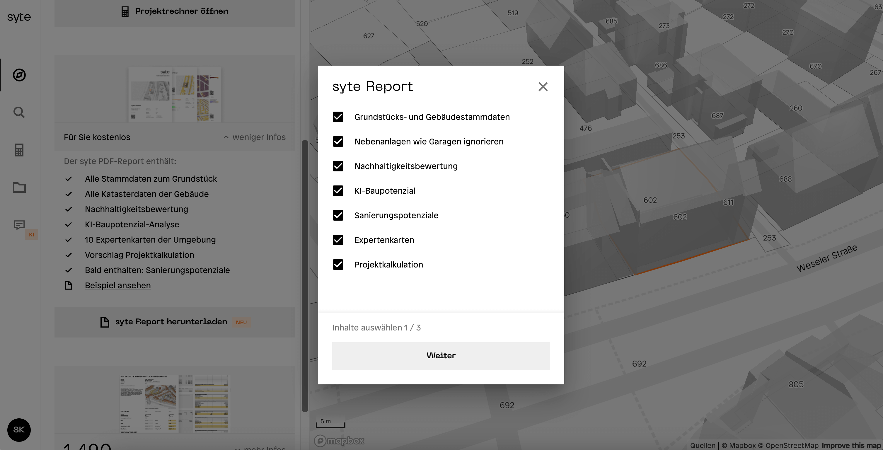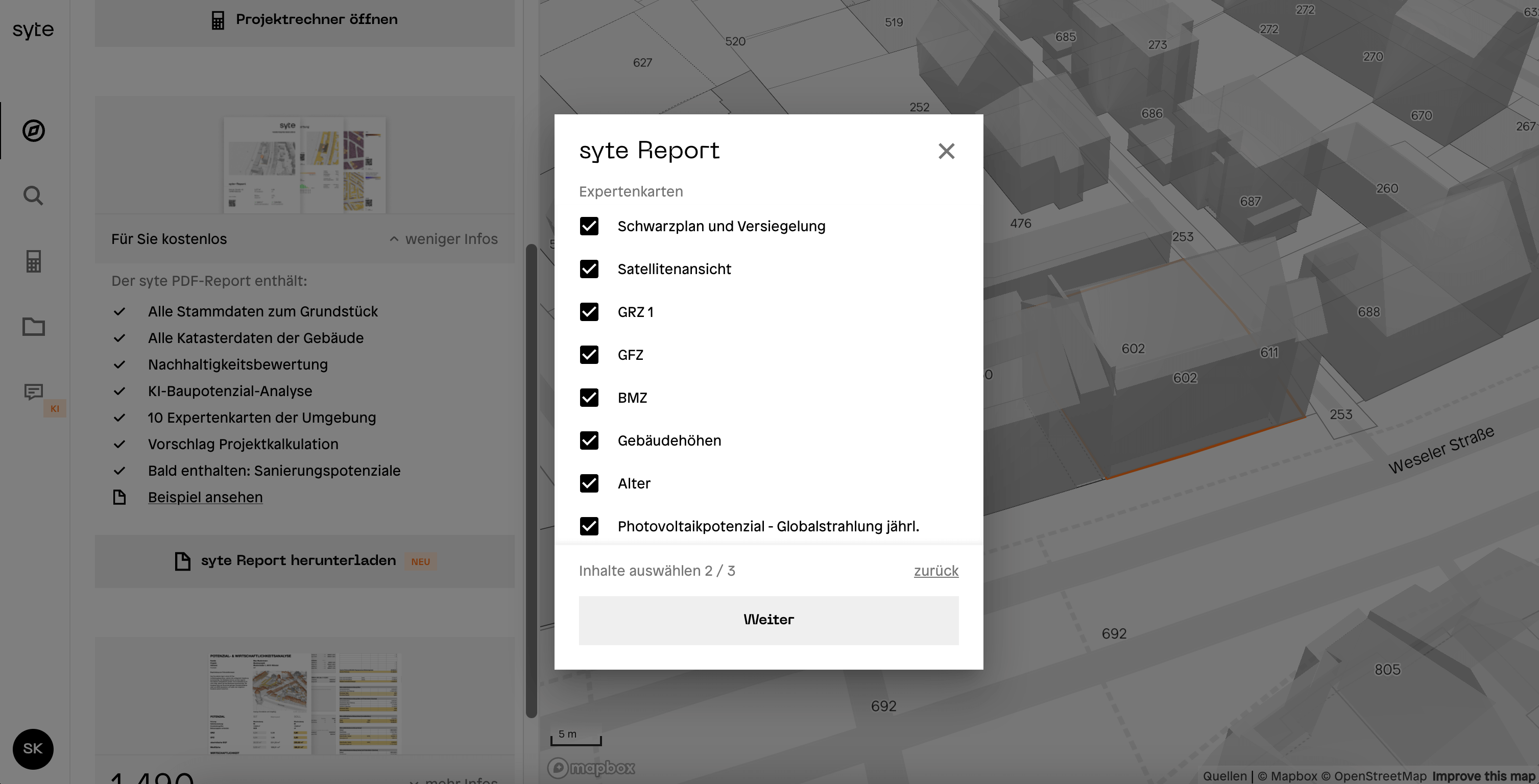 Ab sofort gibt es bei syte Grundstücksberichte mit allen relevanten Informationen zu Grundstücken und Gebäuden. Der Grundstücksbericht enthält alle Informationen, über die syte zum jeweiligen Objekt verfügt. So befinden sich neben Informationen zum Bestand wie Grundstücksgrößen und Bruttogeschossfläche auch Informationen über Photovoltaikerträge, Bebauungspotenziale, Energieeffizienzen und Wirtschaftlichkeitsberechnungen im Report. Zusätzlich stehen Umgebungskarten zur Verfügung, die unter anderem die GRZ und die GFZ der angrenzenden Grundstücke anzeigen. Einzelne Informationsgrundlagen können bei der Erstellung des Reports an- und abgewählt werden.