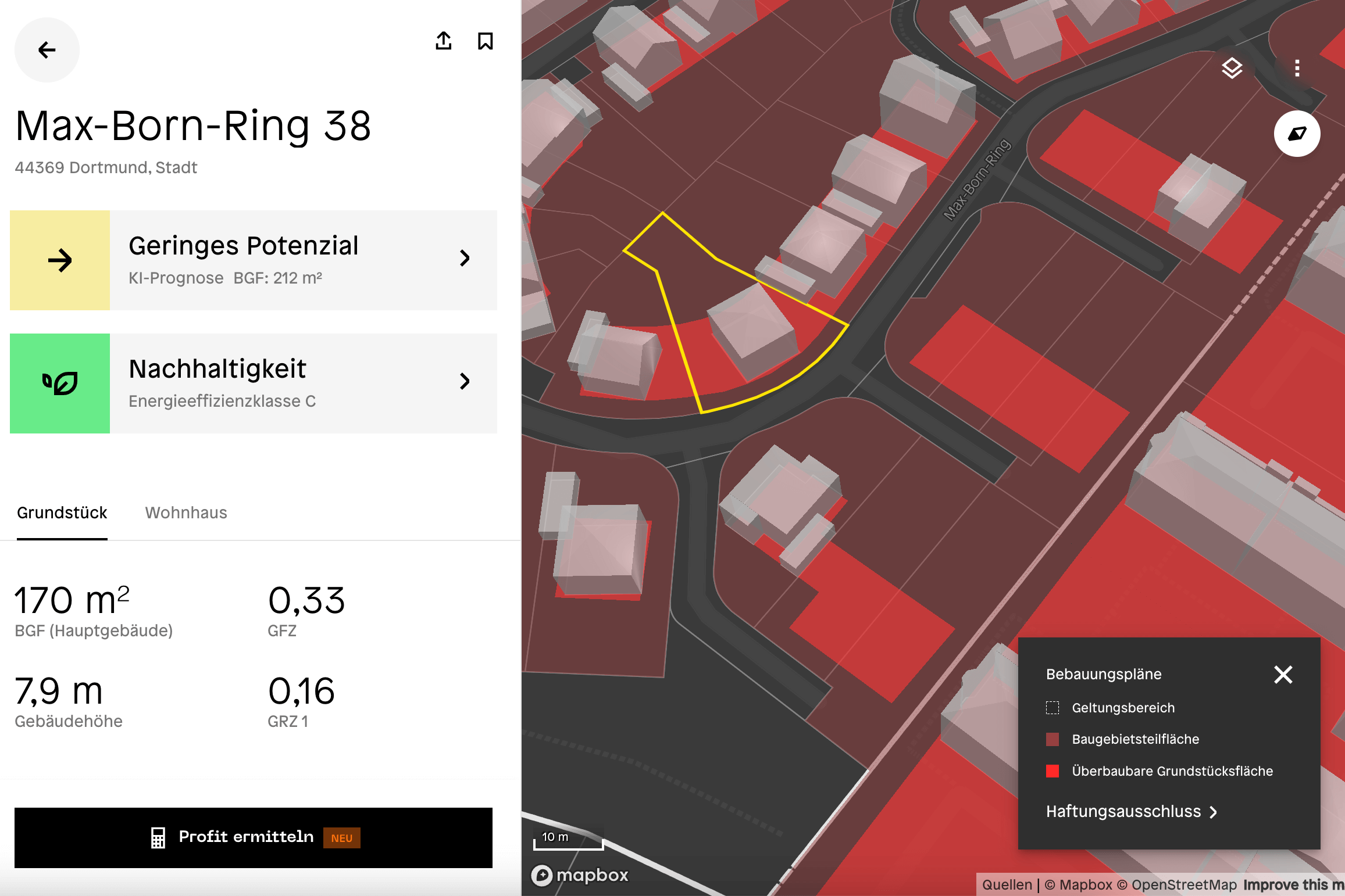 Bisher hat syte jedes Grundstück nach §34 BauGB berechnet - bald werden auch Bebauungspläne hinzugefügt. Dazu ist jetzt eine erste Beta-Version gestartet, in welcher wir die Funktionalitäten testen und im Produkt selbst Anpassungen vornehmen. Bebauungspläne werden bei syte im Rahmen eines Pilotprojekts mit der Stadt Dortmund hinterlegt, sodass diese Funktion zunächst nur auf das Stadtgebiet Dortmund beschränkt ist. Dank der integrierten Bebauungspläne können spezifischere Aussagen nach §30 BauGB getroffen werden.