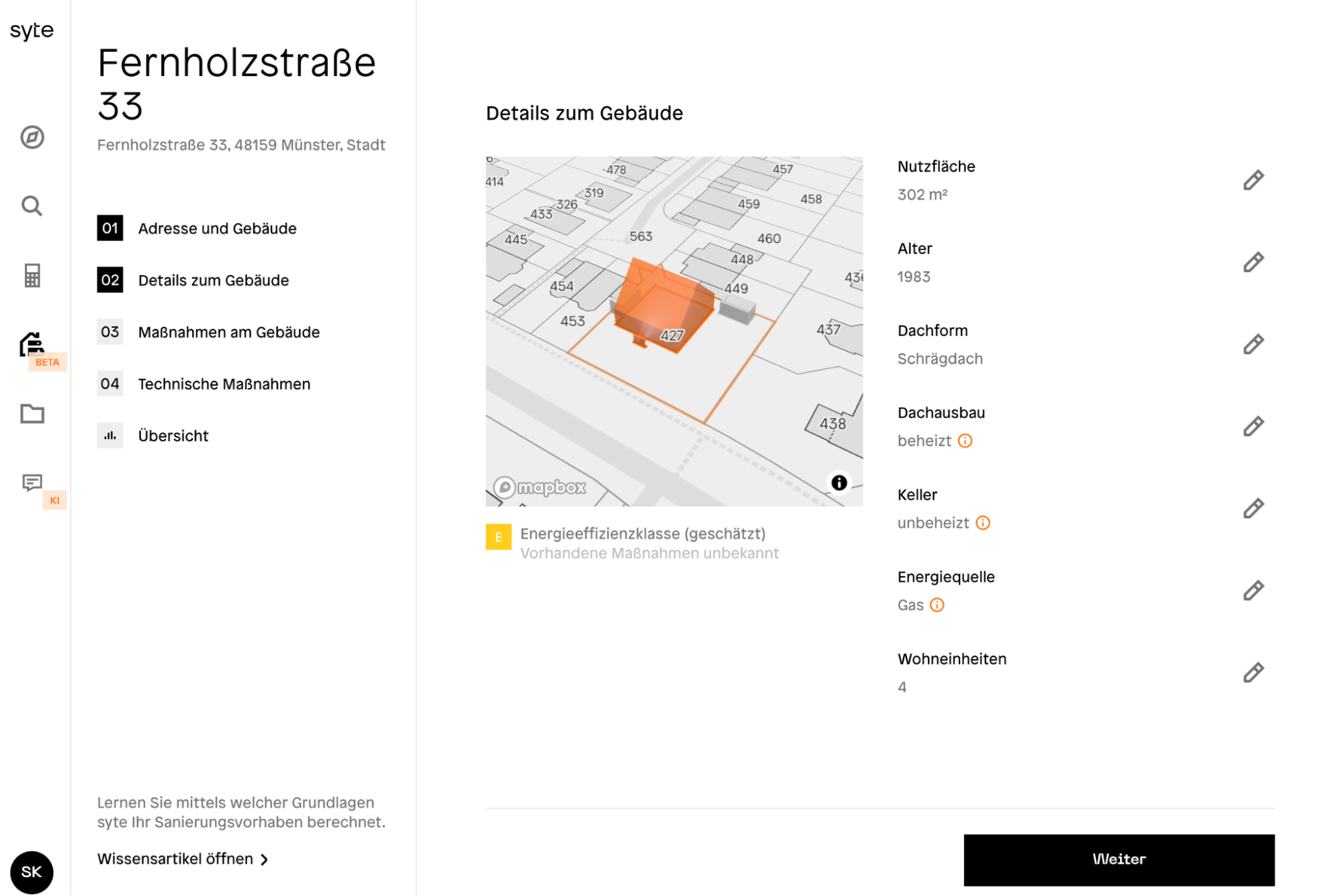 syte präsentiert eine wegweisende Erweiterung seiner Plattform: unsere innovativen Sanierungspläne. Dieses neue Tool kombiniert modernste Technologie und datenbasierte Analysen und revolutioniert damit die Planung und Umsetzung von Gebäudemodernisierungen. Das Besondere: Bereits die Eingabe einer einzigen Adresse liefert fundierte Gebäudeanalysen und Handlungsempfehlungen.